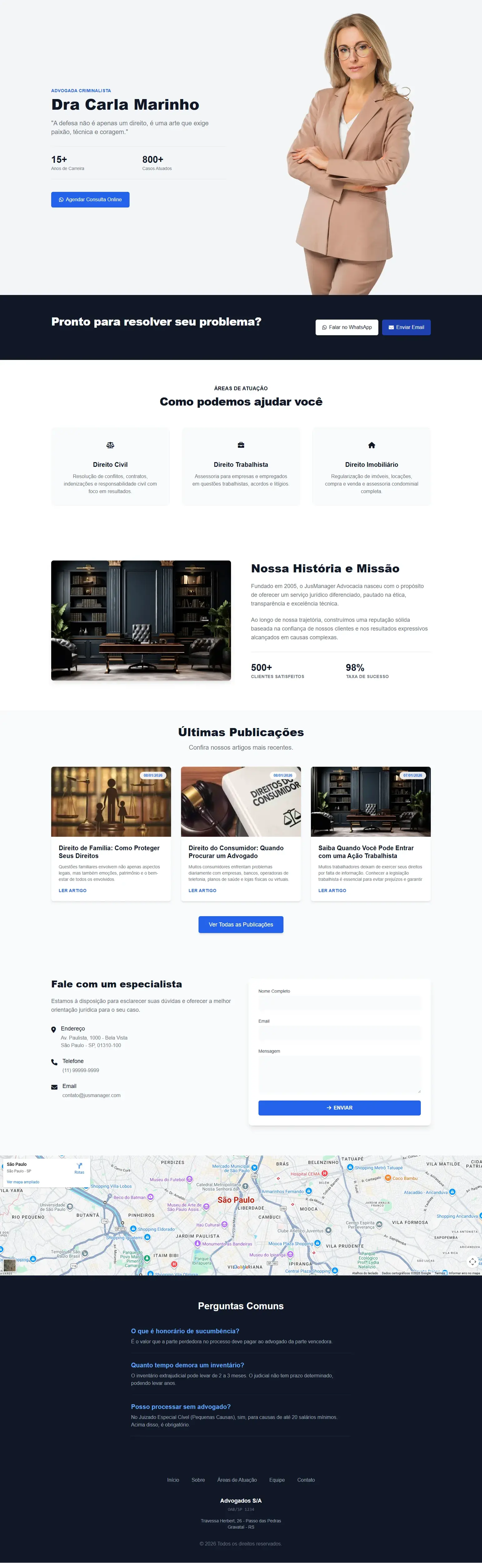 "Nunca imaginei que conseguiria criar meu próprio site. O JusBuilder é incrivelmente intuitivo e o resultado ficou profissional."
